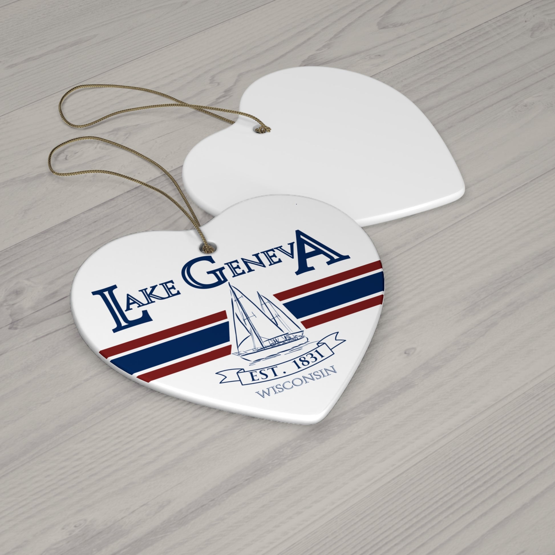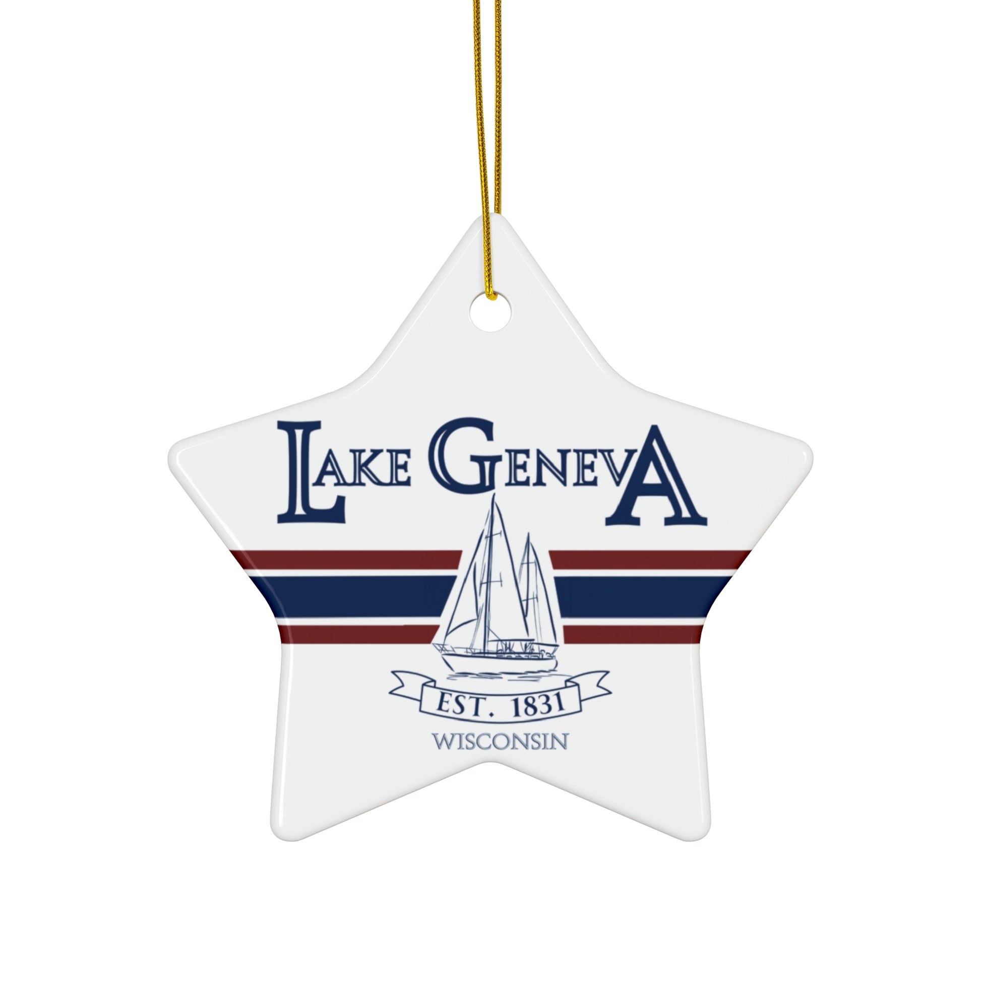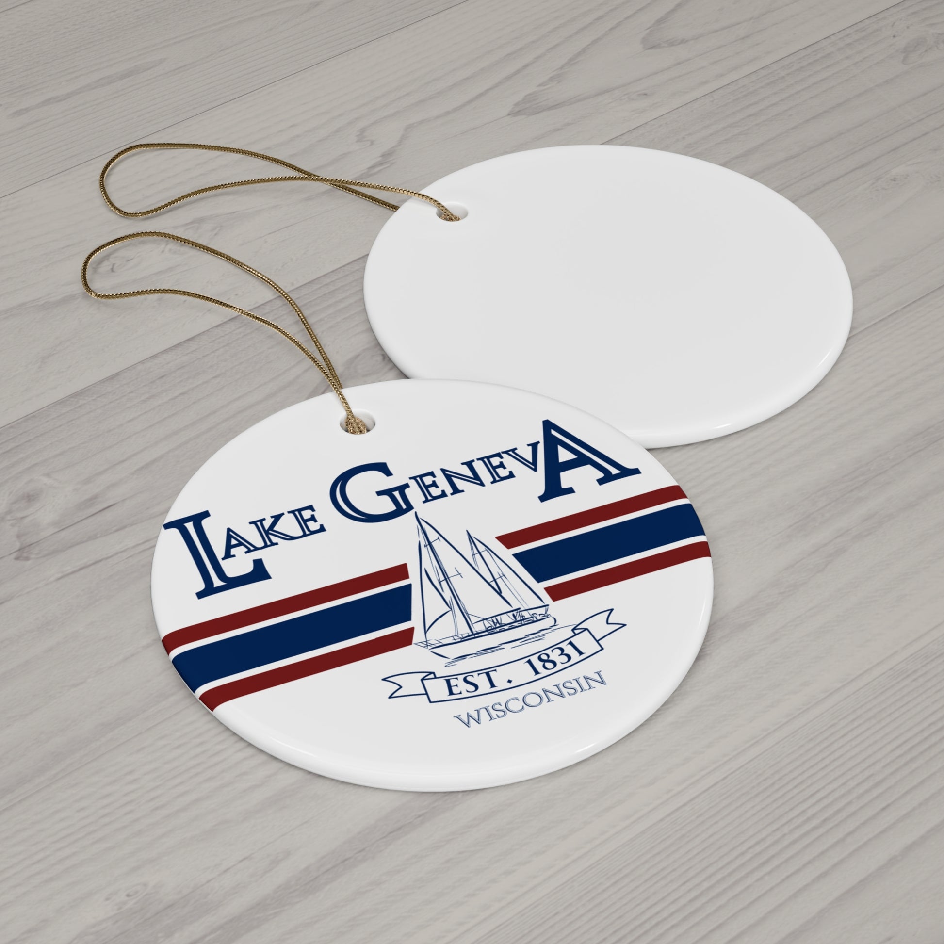 Lake Geneva Wisconsin Christmas Holiday Ornament Boat Ceramic Keepsake Circle